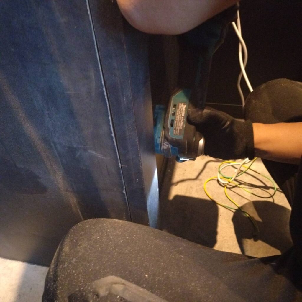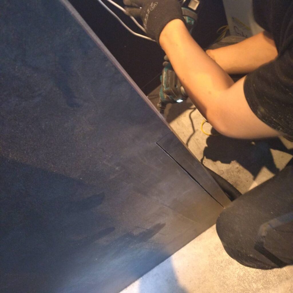 施工事例: 1.窓部社交シール張り及び棚造作 2.鉄部削り作業  3.深夜営業届用図面作成および平米計算