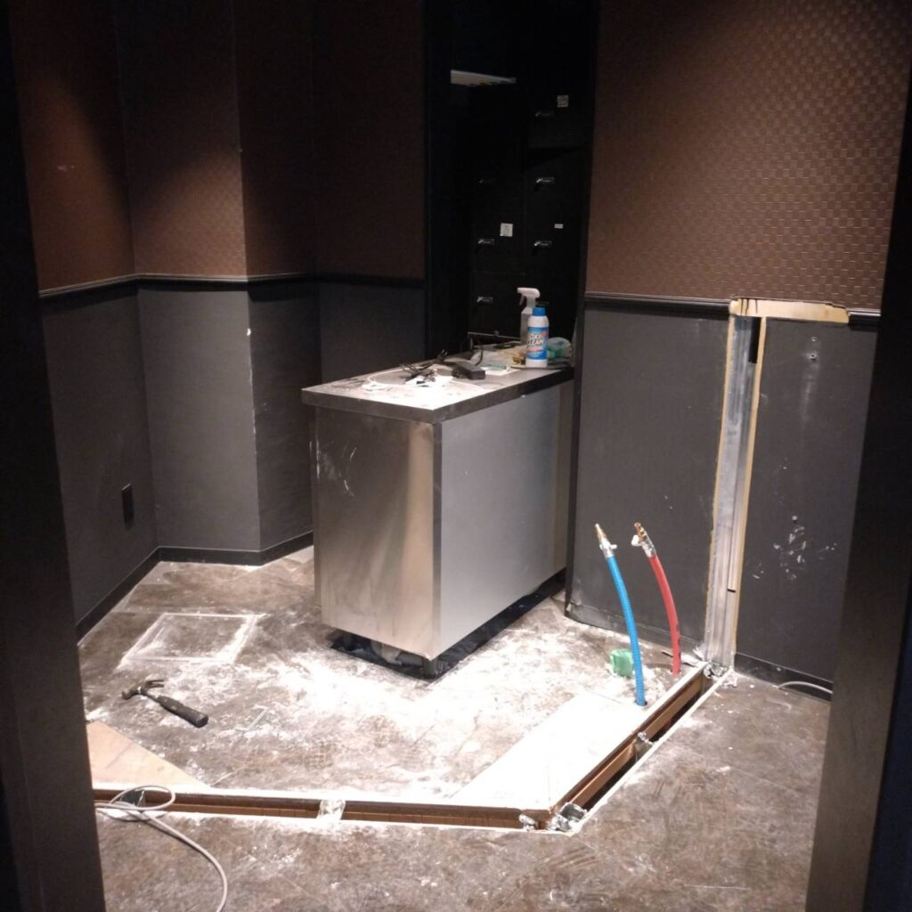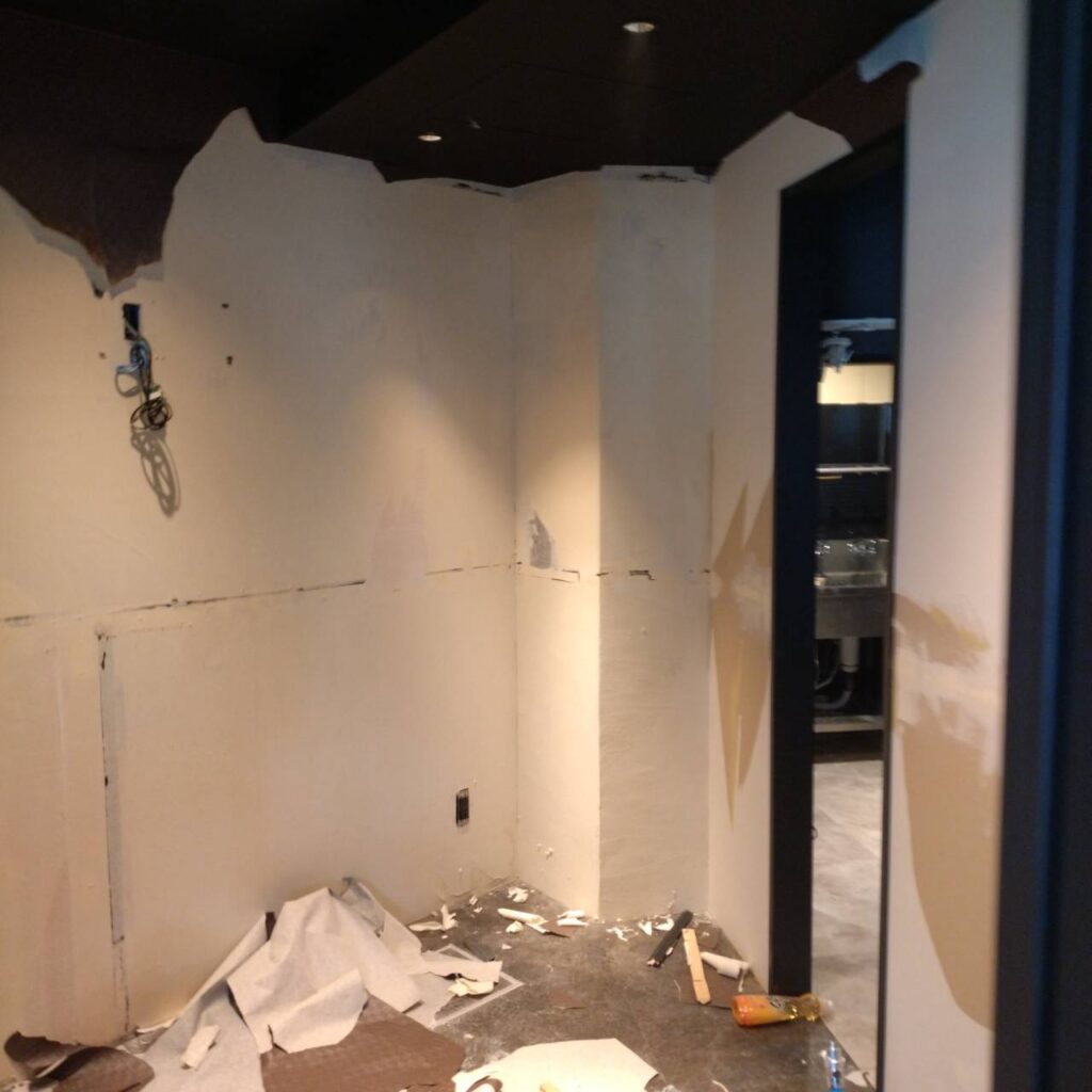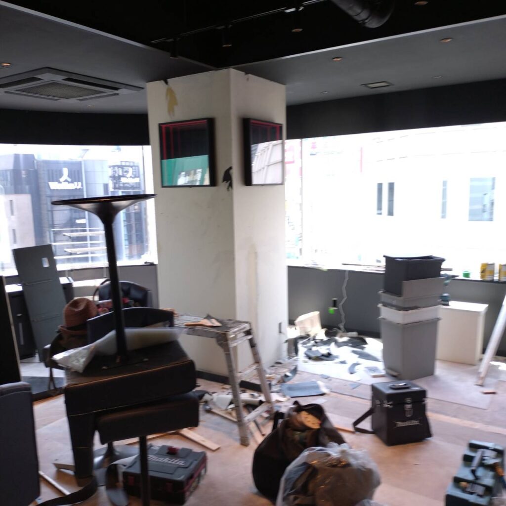 改装中  ・コの字カウンター(天板が光るタイプ)を1部残し解体(電気回路は残したまま) ・個室解体 ・店内全体カラー変更